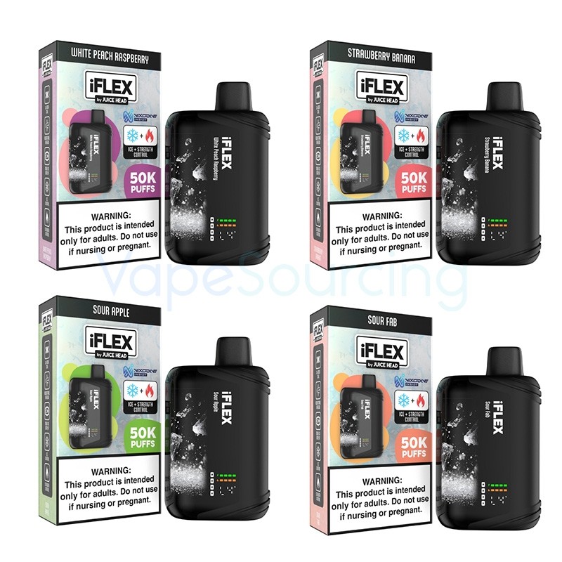 Juice Head iFlex Nixodine 50K Disposable Vape contains 18ml vape juice with nixodine and is powered by an internal rechargeable battery. Juice Head iFlex uses nixodine as the nicotine alternative for similar sensations. It allows you to adjust the strength (output) levels as well as the ice levels. There is a tiny screen attached to this vape and shows the battery level, output power and the ice levels clearly. Juice Head iFlex 50K Nixodine Edition is also enhanced with triple mesh coils for the best flavors.