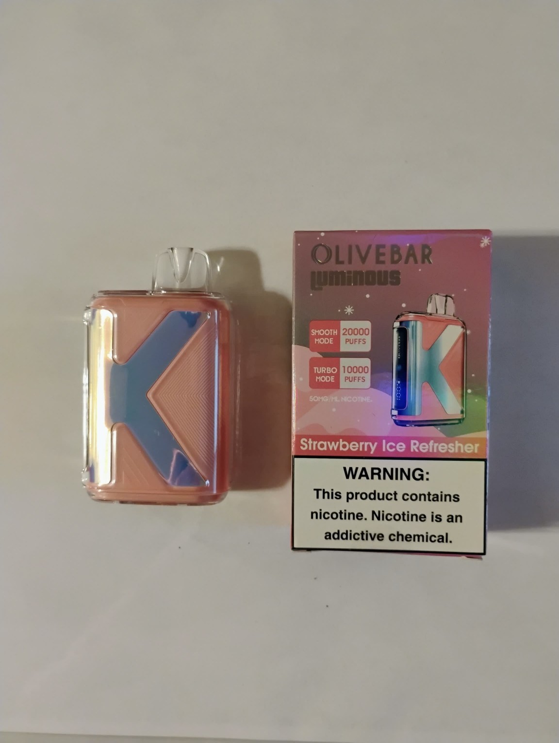 Olive Bar Luminous 20000 Puffs Disposable Vape is a classic disposable kit with a brand-new glow-in-the-dark design. The K symbol will glow in the dark, making OliveBar Luminous 20000 vape unique and eye-catching. This disposable vape is pre-filled with high-quality vape juice and can satisfy at most 20000 puffs under the Smooth Mode. If you switch to the Turbo Mode for more intense flavor production and more vapor, the estimated puff count drops to 10k puffs. There is also a digital screen that shows you the battery level.